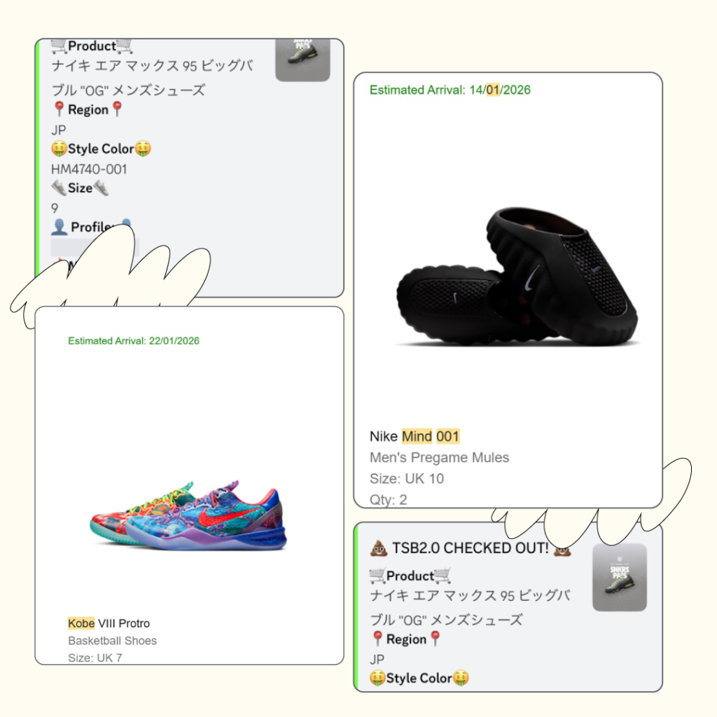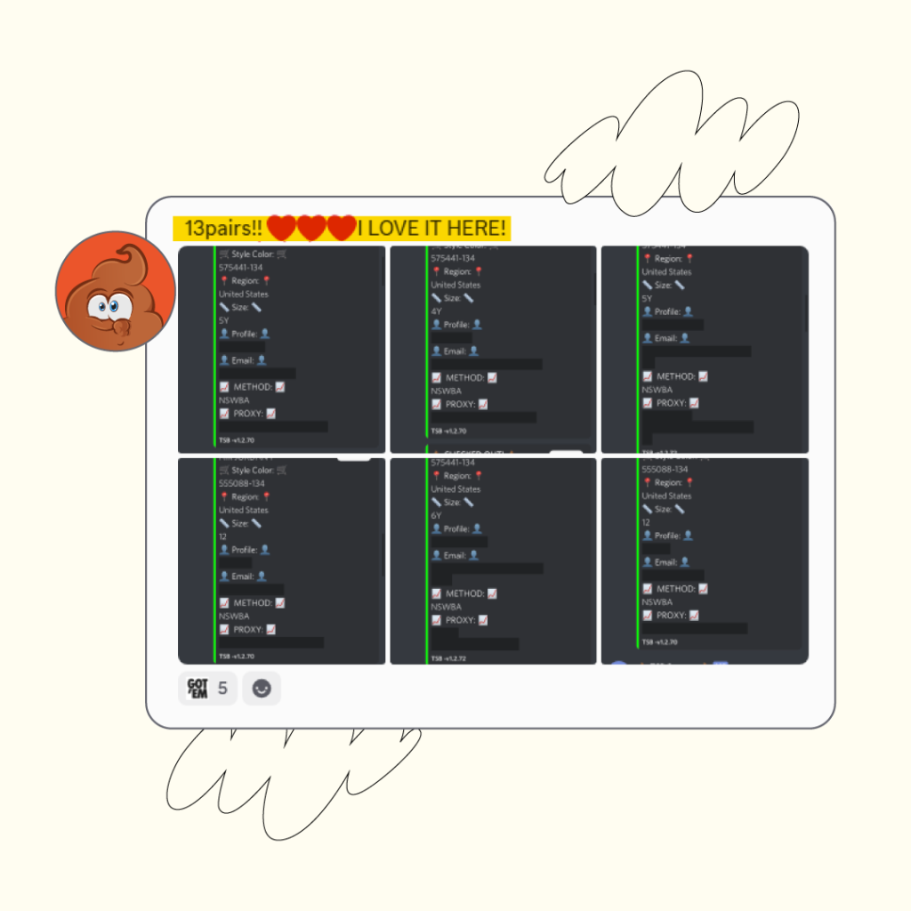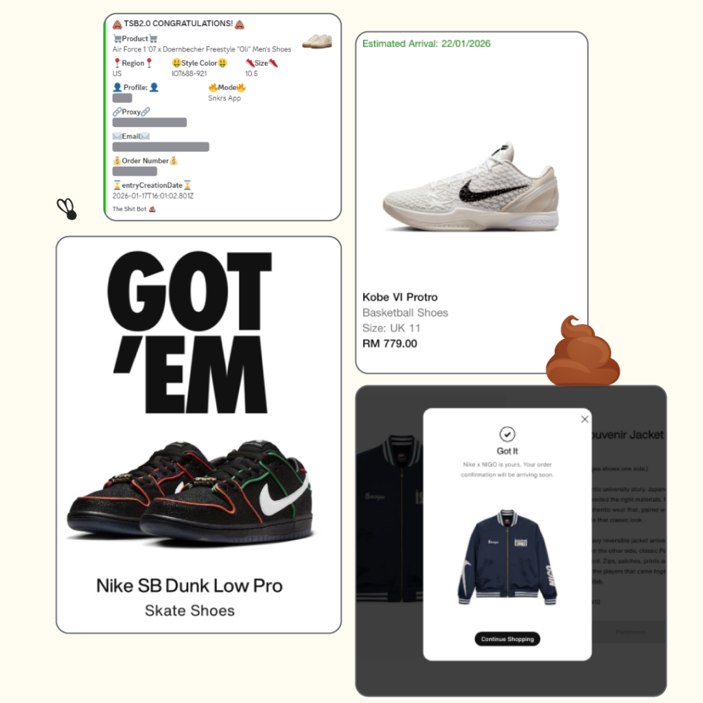 The Shit Bot is built for consistency at scale. Our users aren’t just hitting once; they’re hitting across releases, retailers, and regions with setups designed to grow over time. Whether you’re starting with a single task or running full-scale operations, TSB adapts to your level and helps you expand. From securing one pair to running bulk checkouts across major drops, the goal stays the same: maximize your success rate and turn every release into real, repeatable profit.